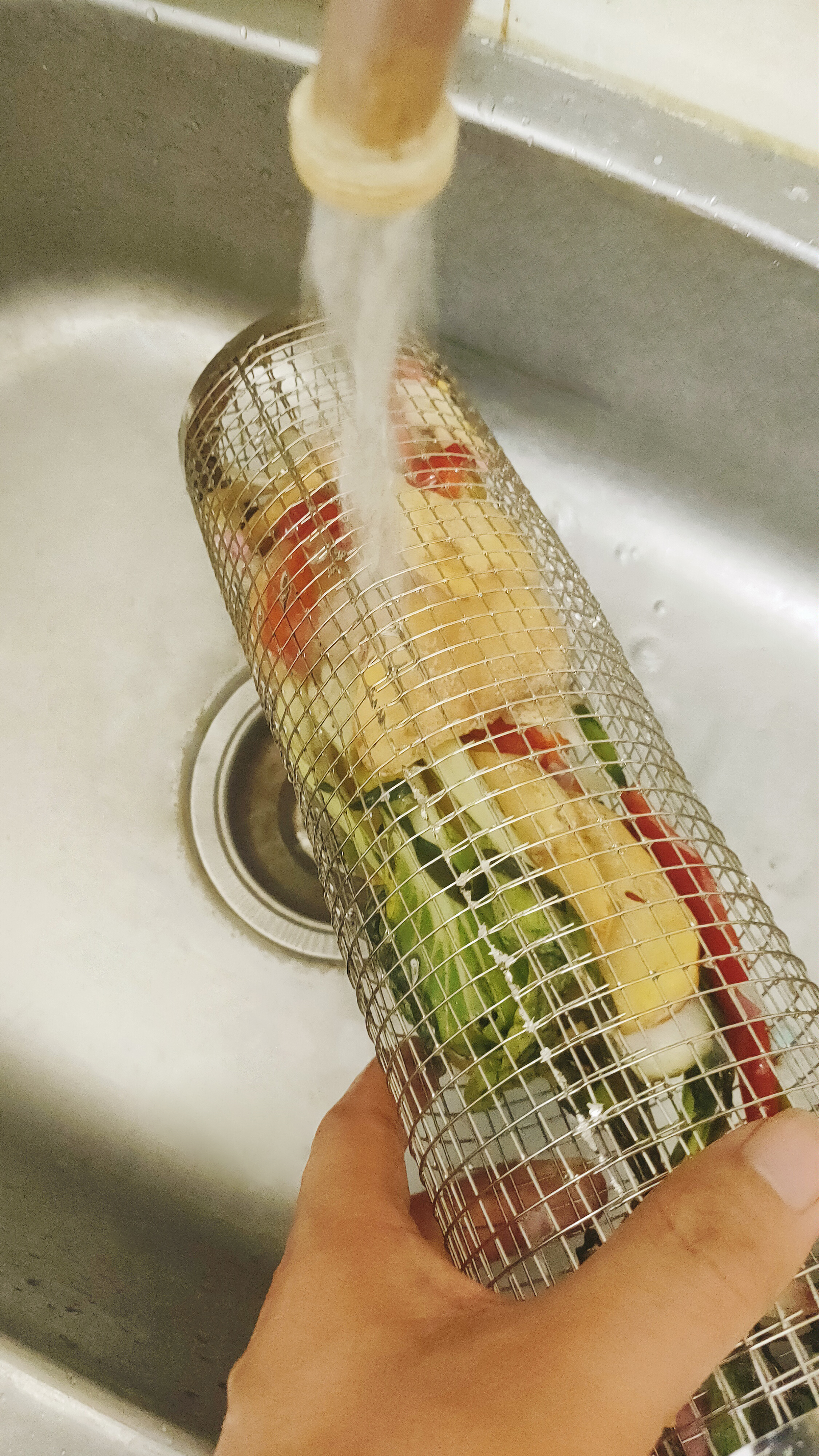 That weekend, he filled the Joyhnny basket with shrimp, sliced zucchini, and mushrooms. No skewers. No toothpicks. Just rolled it gently every few minutes.